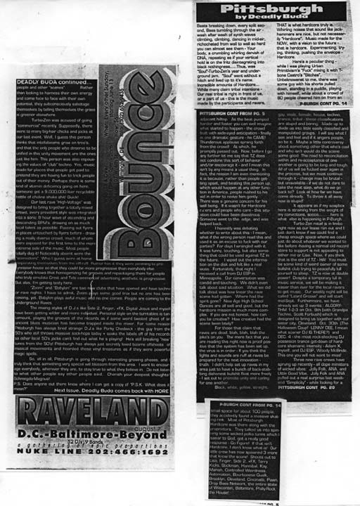 Much as 59 cent facsimiles of hamburgers are designed and produced to maximize profit, so are many facsimiles of something called techno-rave-house-tribal-trance. That is all many of these records do - maximize profit. It is truly disheartening to see d.j.s careers zapped into oblivion by playing this Shit. Another roadblock is that many of the people who say they are “ravers” in Pittsburgh (and many other places) are always attempting to imitate other people and other “scenes’. Rather than looking to harness their own energy and come face to face with their own potential, they subconsciously sabotage themselves by telling themselves the grass is greener elsewhere.