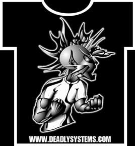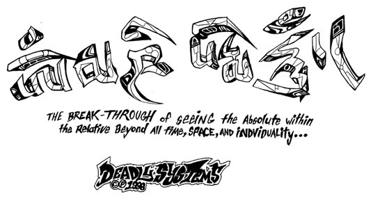 The left piece became the standard DS “coportate style logo. Previously, the middle piece represented DS. The “S” is actually the symbol for the bodhisatva Jizo Bosatsu, who is the patron of gamblers,lost causes, travelers, and the dead - especially children. The far right piece is a common tibetan script (Ume), written in American Graffiti Style. It is the slogan for Deadly Systems, and also is generally regarded as the epitome of all Buddhist teachings. In essemce, it represents: “The breakthrough of seeing the absolute in the relative, beyond time, space and individuality.