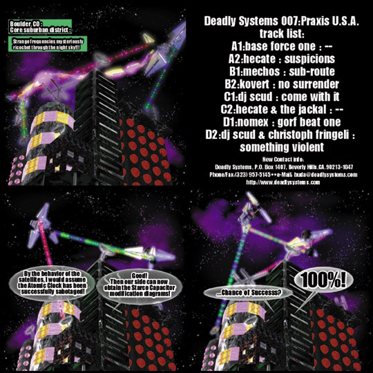 Starting with DS004, the vinyl records were to tell a story that would continue with each release. You can check out the story so far by clicking here. For the most part, the inside labels just had a clip of the graphic from the cover. exceptions were DS004 and it’s rather bleak “AIDs warning” which I haven’t put up because people got so unerved by it that it’s a pain to deal with. In retrospect, it was a little over the top, though that was what the record was attempting at the time. To your right is the label graphic from DS 007. I used Lightwave 5.6, Adobe Illustrator, and Adobe Photoshop on the piece.