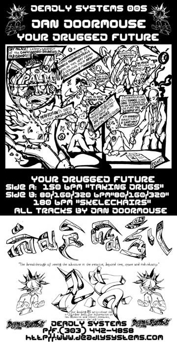 DS 005 “Your Drugged Future” Dan Doormouse: hand sketched and inked, layout with Adobe Illustrator and Photoshop. (1999)