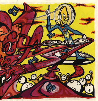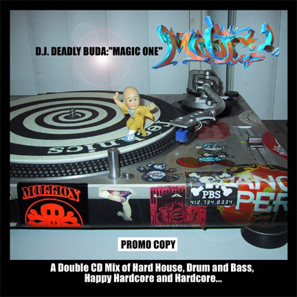 “Original” Deadly Buda “Magic 1” CD cover:This is the “demo of the demo” cover for the upcoming mix CD. Kim Henderson took the photo of my turntable. This will probably be used for the inside cover. This was done in Lightwave 6.5, Adobe Photoshop and Illustrator. (2001).
