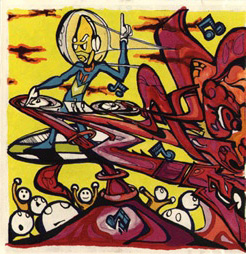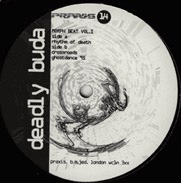 Deadly Buda “Morph Beat One” Praxis Records vinyl label: I did not lay this out. Praxis actually used one of my drawings and slightly modified it, I imagine in Photoshop. You can see the actual drawing by clicking here (1994).